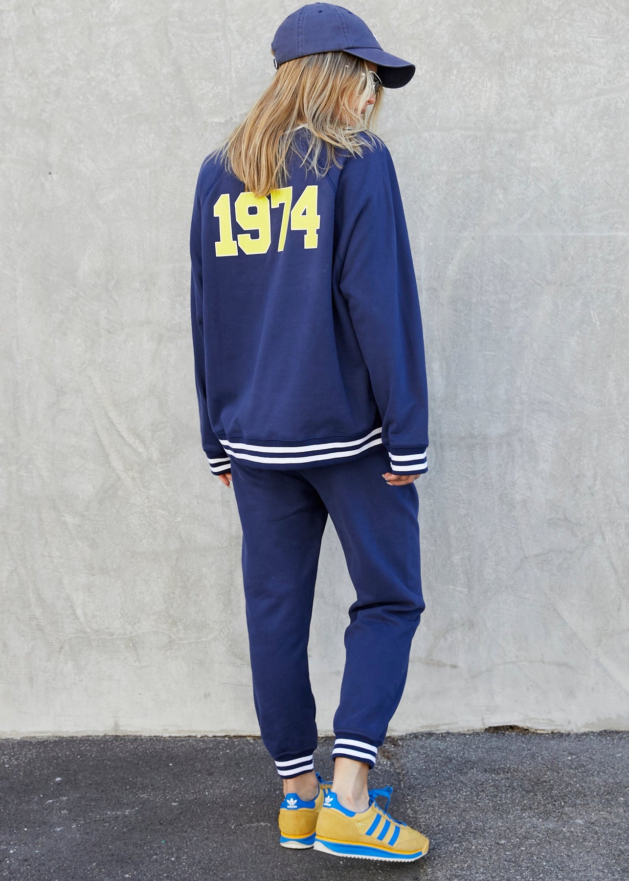 The soft navy sweat features bold collegiate Hammill Sport on the front and yellow/white  1974 print on the back.