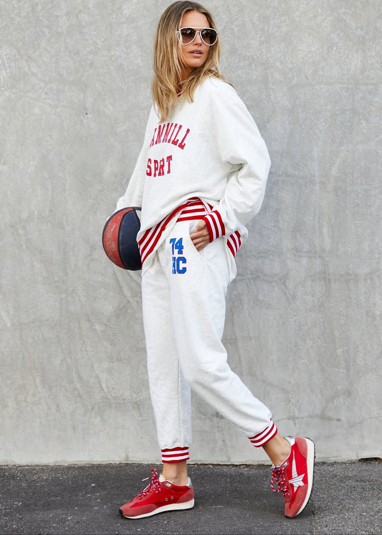 Hammill & Co sporty sweat captures an effortless retro-varsity mood with a relaxed feel! The soft oatmeal marle sweat features bold collegiate Hammill Sport on the front and royal/red 74 print on the back.