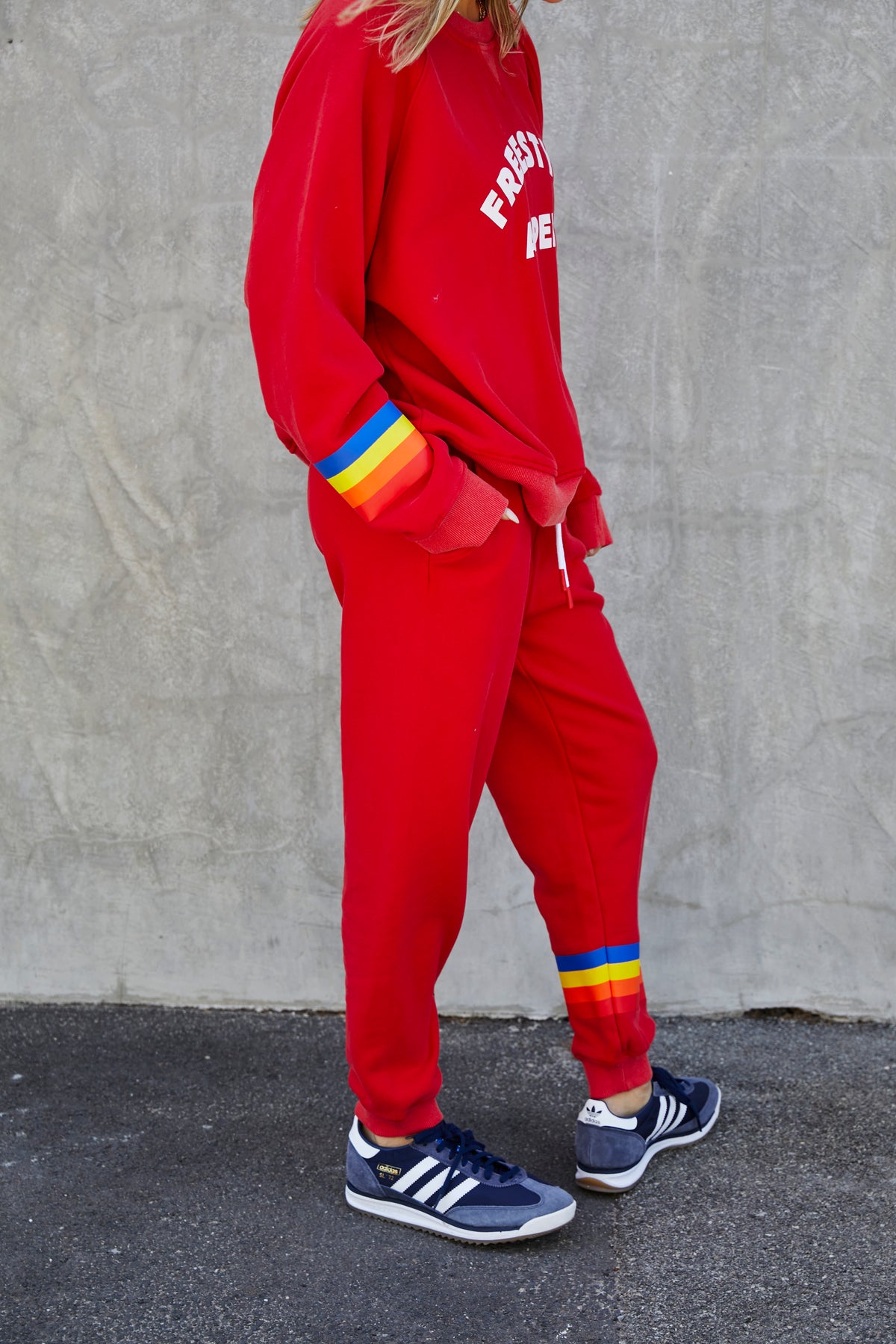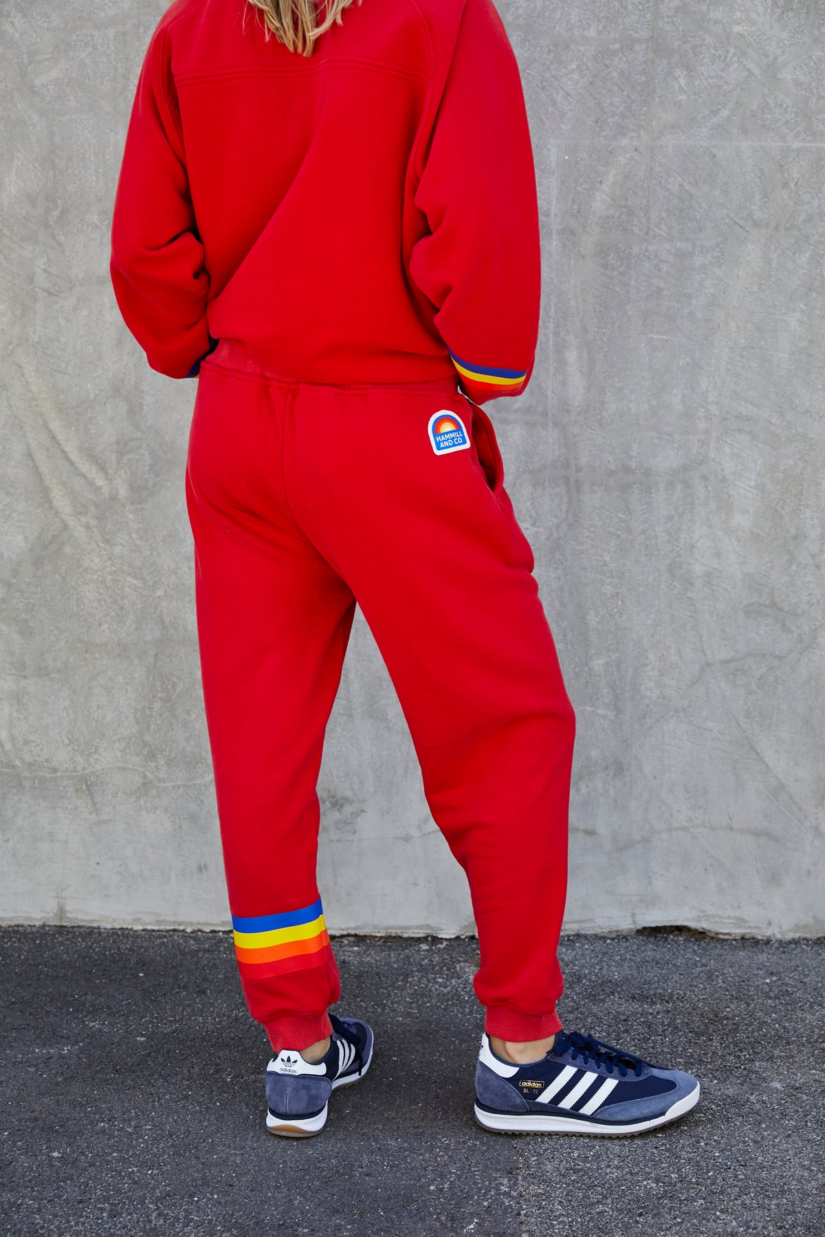Retro trackie pant in Vintage wash red with signature stripes on the left leg. Sporty white draw cord, elastic waist and jogger rib cuffs!